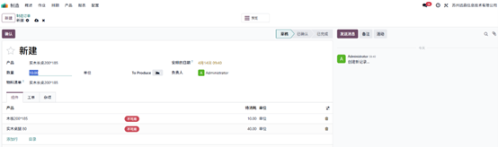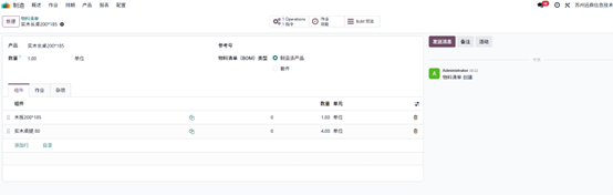 选择目标产品,指定对应的产品变体与数量,将物料清单类型设为 "生产此产品"。在零部件选项卡中添加物料清单,例如桌面、桌腿等,如下图所示。