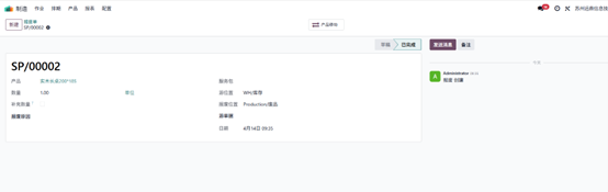 选择此前创建的物料清单,将产品设为 "桌子",系统将自动加载关联流程与零部件。核对订单信息后点击确认 ,随后点击计划 按钮,如下图所示。