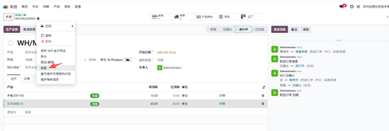 在此环节,若发现零部件损坏,可创建废品单。点击设置图标,选择废品 选项,如下图所示。