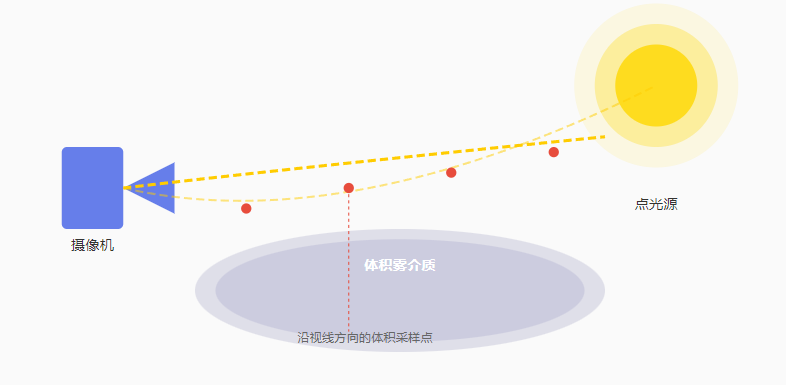 体积渲染的核心思想是:将三维空间中的介质(如雾气、烟尘、光线中的粒子)视为无数微小的体积元素,通过累积这些元素对光线的吸收和散射,最终得到视觉效果。