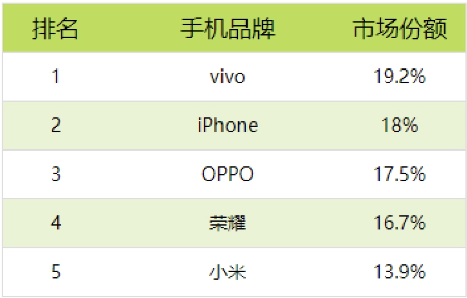将2022年手机销量排行榜前五名的手机品牌和销售市场份额定义在数组中,对数组按手机销售市场份额进行降序排序,将排序后的手机品牌排名、手机品牌和市场份额输出在页面中。代码如下: