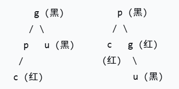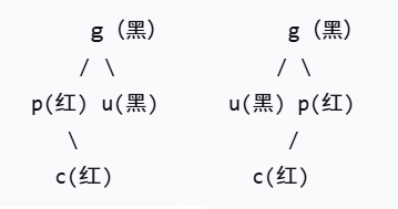 第二种情况为c、p都为红色,g为黑色,而u不存在或者u存在且为黑。
