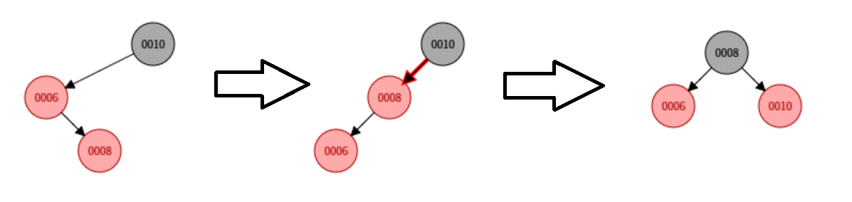 当新插入的红色节点位于父节点的内侧 (即父为左子时新节点是右子,或父为右子时新节点是左子)且叔父为黑色时,直接单旋无法一步到位,因为此时新节点处在"拐弯"位置;处理方法是先对父节点 执行一次反向单旋,把新节点转到外侧,此时结构退化为情况二的"外侧直线"形态,再对爷爷节点 执行一次朝向新节点方向的单旋,最后将新节点染黑、爷爷染红即可。这整个过程包含两次旋转和两次变色,因此称为双旋加变色,目的是在维持黑高不变的前提下,将原本嵌在中间的红节点提为子树的黑色新根,从而彻底消除连续红色冲突。