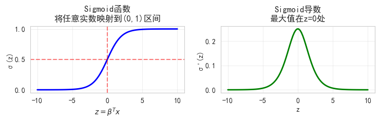 axes[1].set_title('Sigmoid导数\n最大值在z=0处')