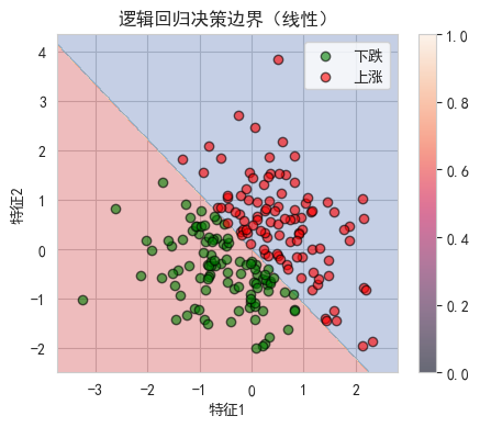 - 负系数: 该特征值越大,预测下跌的概率越高