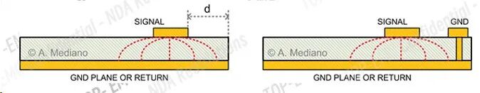 (1)时钟信号不能画在板子边缘,下方或相邻的参考地平面可能被切断或不足,迫使信号回流路径绕行较远距离,就会如下图一样产生一些空间串扰。