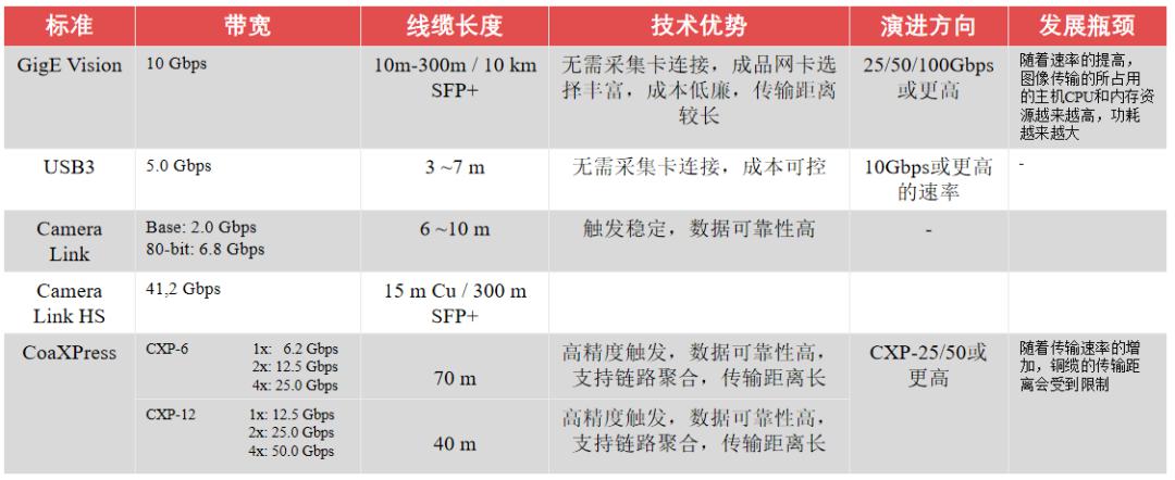 根据带宽(速度)、距离、成本和稳定性要求综合选择接口。GigE 适用于大多数工厂自动化场景;USB3 适合桌面和短距离应用;Camera Link 和 CoaXPress 则面向高端高速需求。