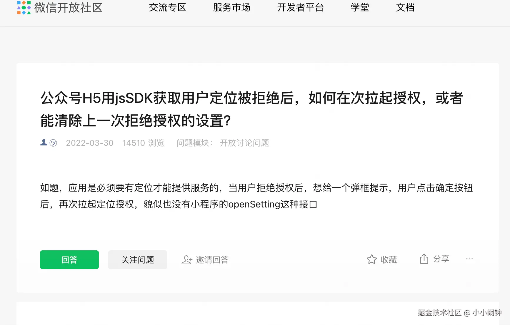 解决方案:如果用户拒绝定位,通过弹窗文案提示引导用户去 手机设置 → 微信 → 位置 手动开启权限