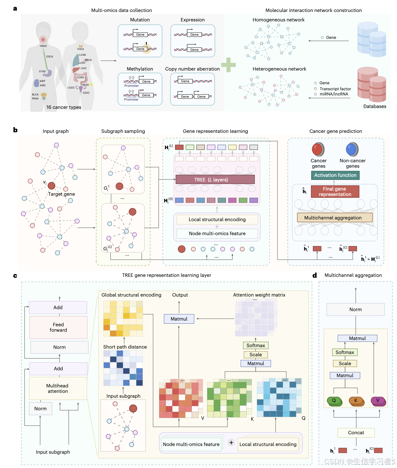把基因 / TF/miRNA/lncRNA 构成的同质 / 异质生物网络 + 4 类多组学信号一起输入,用 Transformer 注意力学习基因嵌入,最后做二分类判断是否为癌基因。