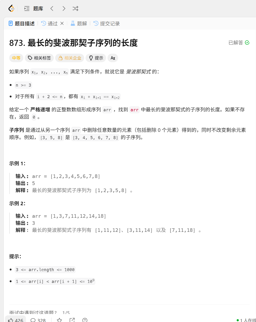 int lenLongestFibSubseq(vector<int>& arr) {