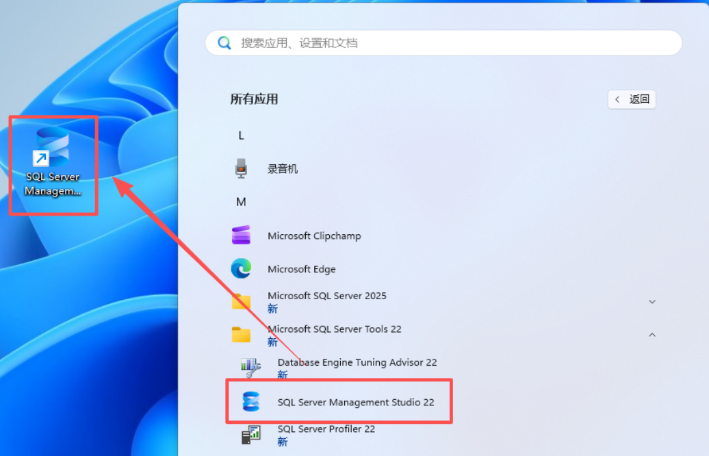 25.开始菜单把 【SQL Server Management Studio 22】图标拖到电脑桌面。