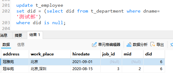 where did in (select did from t_employee where ename='白露' or ename='谢吉娜');