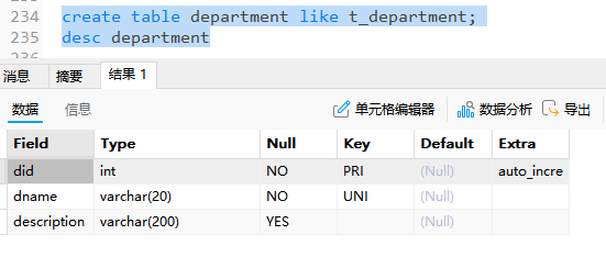 create table emp as (select eid,ename,salary,tel,`mid` from t_employee where salary<10000);