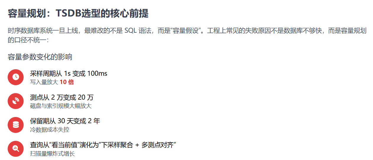 当你用同一套容量口径与压测验收去评估 TSDB,数据库之间的差异就会自然显现:谁更适合你的写入模式,谁在后台合并时更稳定,谁在长周期留存与下采样查询上更省资源。