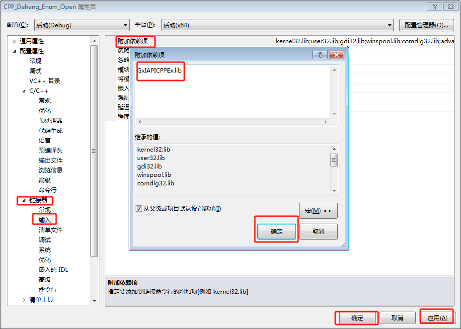 排查2:"附加依赖项"是否输入了"GxIAPICPPEx.lib",是否多字少字,是否不符合当前的版本64位/32位。