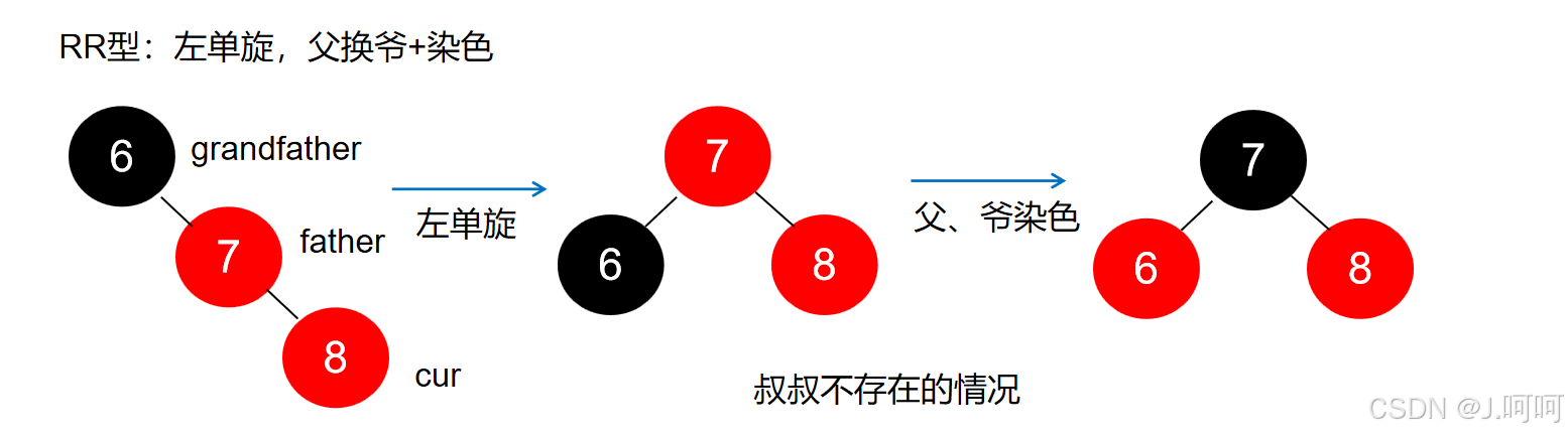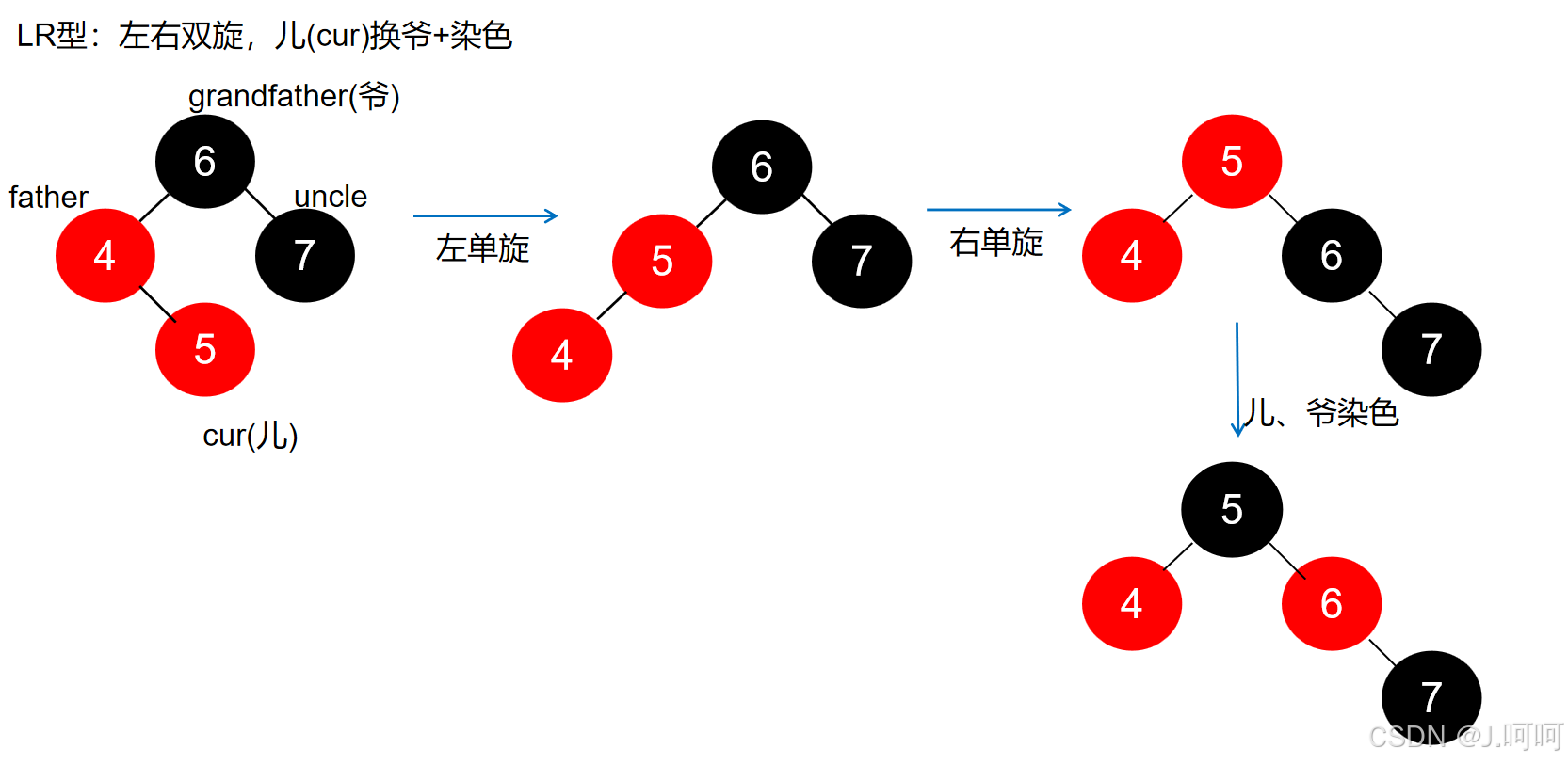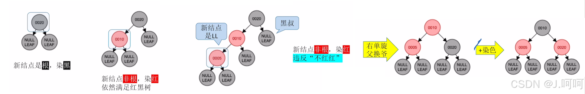 类似于AVL树,同样有左单旋,右单旋,左右双旋,右左双旋这四种,只是还会加上颜色变换。