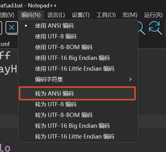 注:如果出现乱码的情况,有可能是脚本编辑的时候使用UTF-8编码,而命令工具使用ANSI(GBK)编码,需要使用notepad++或者其他工具转码