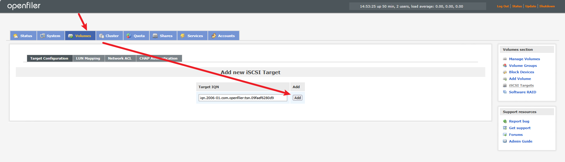 添加 iSCSI Target ,点击Add新建Target,Target IQN保持默认或自定义