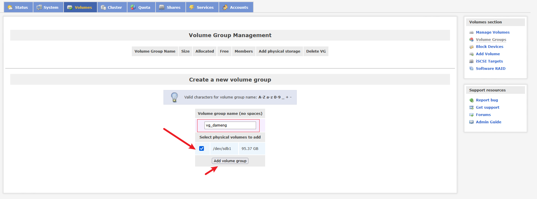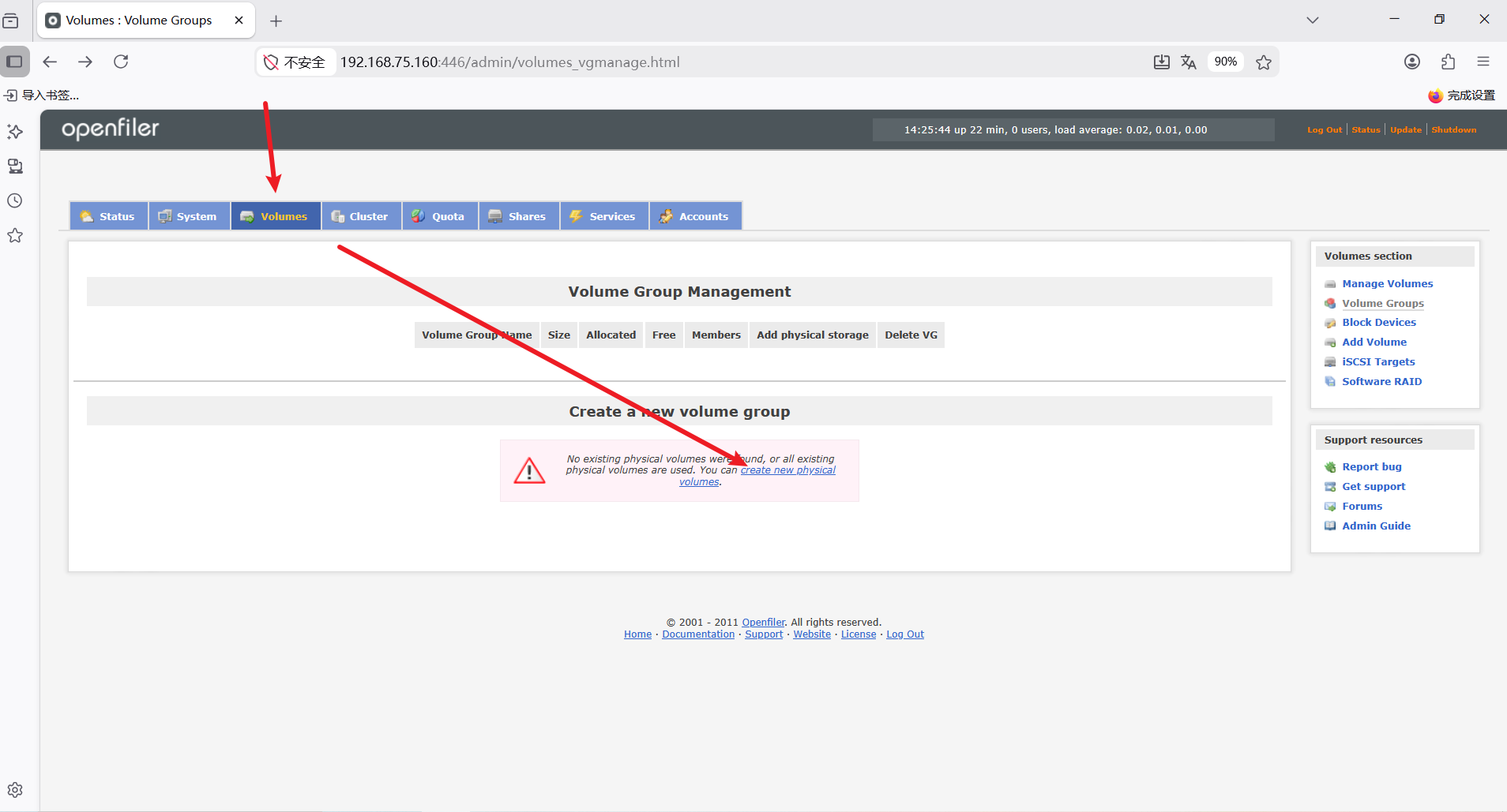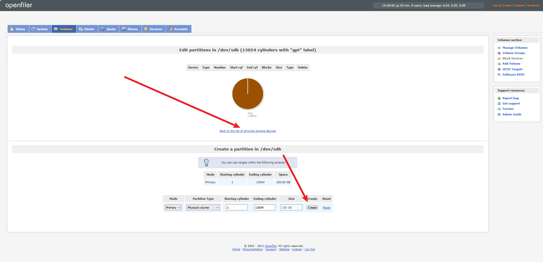 点击create new physical volumes后可以看到我们新加的100G盘,已经被识别为/dev/sdb,点击/dev/sdb