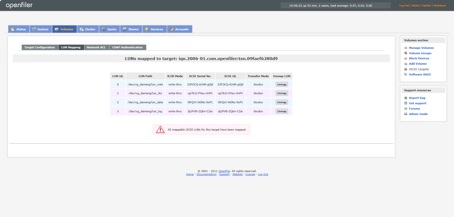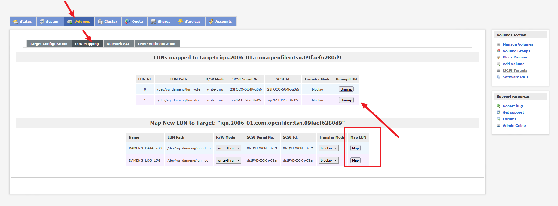 将4个LUN(lun_vote、lun_dcr、lun_data、lun_log)全部映射