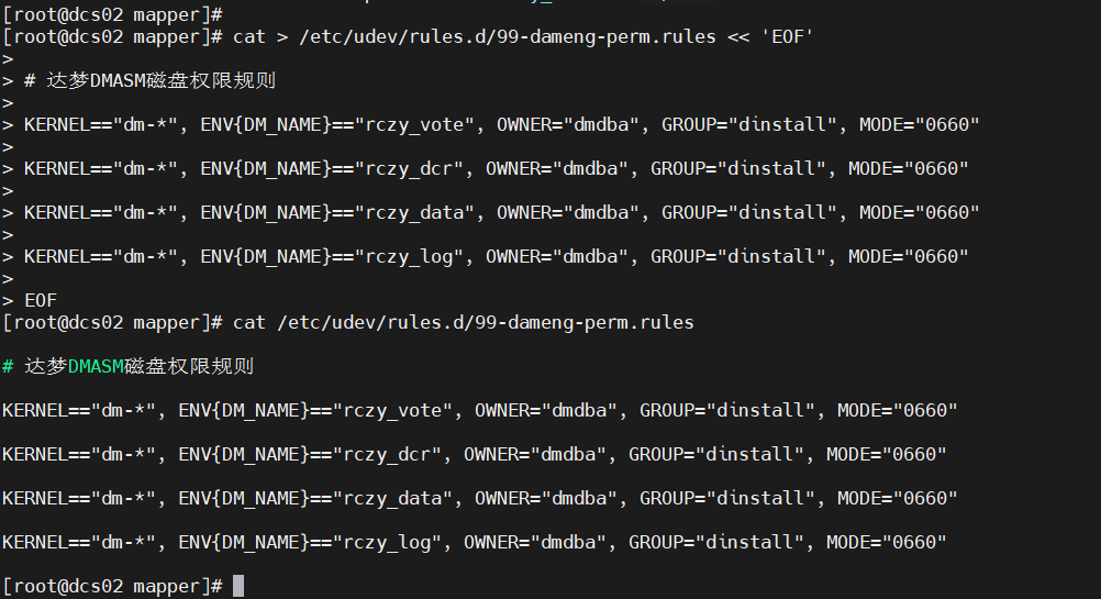 | # 在两台节点上都创建这个文件 cat > /etc/udev/rules.d/99-dameng-perm.rules << 'EOF' # 达梦DMASM磁盘权限规则 KERNEL=="dm-*", ENV{DM_NAME}=="rczy_vote", OWNER="dmdba", GROUP="dinstall", MODE="0660" KERNEL=="dm-*", ENV{DM_NAME}=="rczy_dcr", OWNER="dmdba", GROUP="dinstall", MODE="0660" KERNEL=="dm-*", ENV{DM_NAME}=="rczy_data", OWNER="dmdba", GROUP="dinstall", MODE="0660" KERNEL=="dm-*", ENV{DM_NAME}=="rczy_log", OWNER="dmdba", GROUP="dinstall", MODE="0660" EOF |