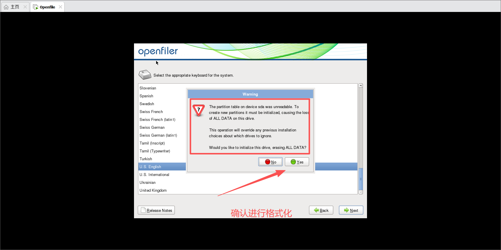 警告:设备sda上的分区表不可读。创建新的分区,它被初始化,造成的损失掉这个驱动器上的所有数据。此操作将重写任何以前安装的选择,带动忽视。你想要初始化这个驱动器,清除所有数据?