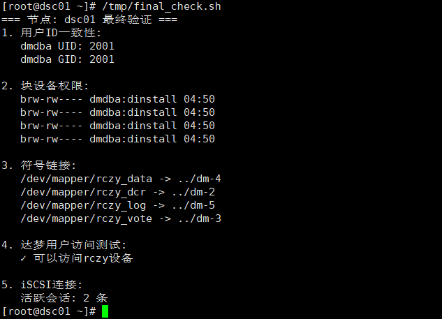 | # 在两台节点上都执行这个验证脚本 cat > /tmp/final_check.sh << 'EOF' #!/bin/bash echo "=== 节点: (hostname) 最终验证 ===" echo "1. 用户ID一致性:" echo " dmdba UID: (id -u dmdba)" echo " dmdba GID: (id -g dmdba)" echo -e "\\n2. 块设备权限:" ls -l /dev/dm-2 /dev/dm-3 /dev/dm-4 /dev/dm-5 2\>/dev/null \| awk '{print " "1" "3":"4" "9}' echo -e "\\n3. 符号链接:" ls -l /dev/mapper/rczy_\* 2\>/dev/null \| awk '{print " "9" -> "11}' echo -e "\\n4. 达梦用户访问测试:" sudo -u dmdba bash -c "ls -l /dev/mapper/rczy_\* \>/dev/null 2\>\&1 \&\& echo ' ✓ 可以访问rczy设备' \|\| echo ' ✗ 无法访问'" echo -e "\\n5. iSCSI连接:" iscsiadm -m session 2\>/dev/null \| wc -l \| awk '{print " 活跃会话: "1" 条"}' EOF chmod +x /tmp/final_check.sh /tmp/final_check.sh |