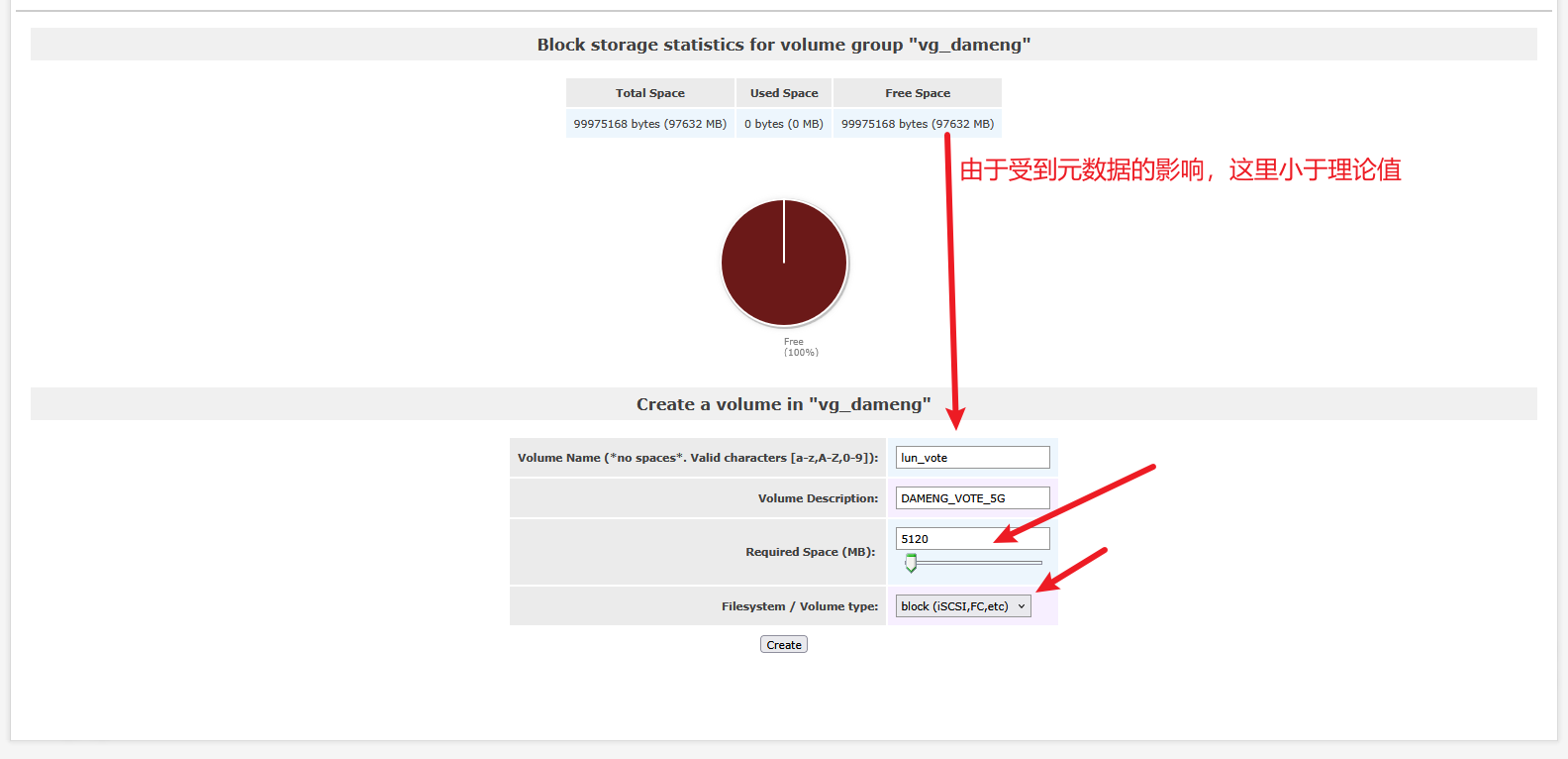 输入内容,调整磁盘大小,卷类型选择block(iSCSI,FC,etc),按照表格创建四个逻辑卷