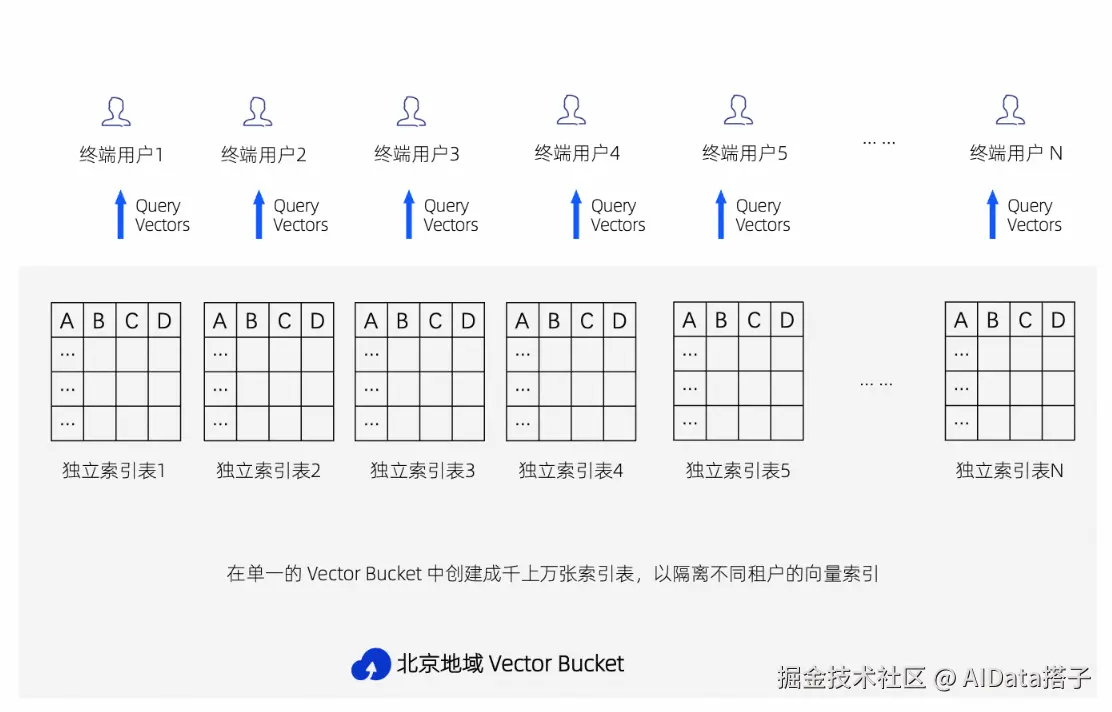 OSS 向量 Bucket 支持同一账号在同一地域创建大量向量索引(Index)。通过多索引架构,可以按租户或业务维度拆分数据,兼顾隔离性和检索性能。