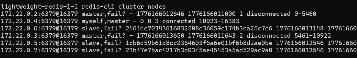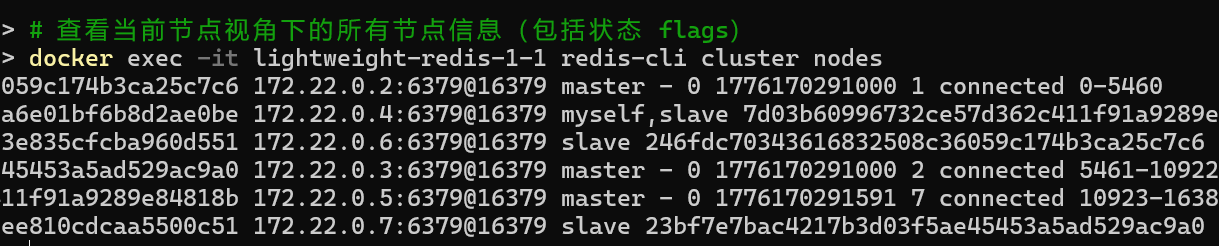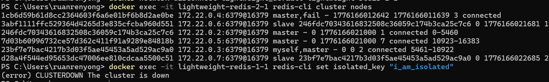 从上面的图片可以看出 我们一开始有三个主节点三个从节点 然后手动断连了一个 可以看到由于哨兵机制的存在 从节点升级为主节点了 在我们尝试给断联的旧主节点添加的时候可以看到这里触发了默认的自我保护机制 因为可以看到172.22.0.4这个节点已经被标记为故障节点了 因为在redis中 如果一个主节点无法联系到半数以上的主节点,它会拒绝写入 每个节点基于本地视角独立决策 而不是其他节点尝试连接判断该节点是否能够联系上