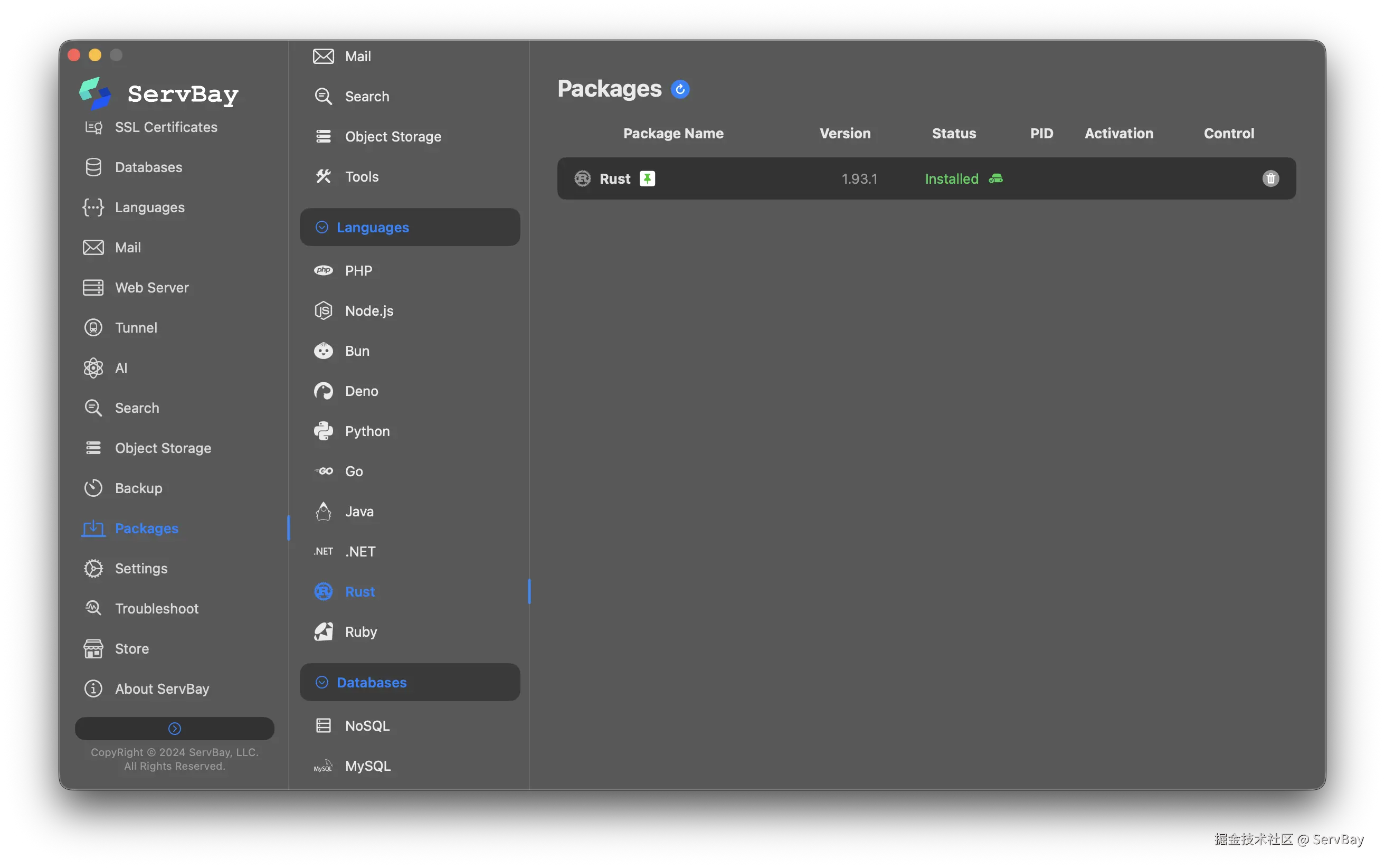 配置 Rust 开发环境有时会涉及环境变量、编译器版本以及相关底层库的安装,如果用 ServBay 进行一键部署Rust,就不用管这些乱七八糟的东西了。