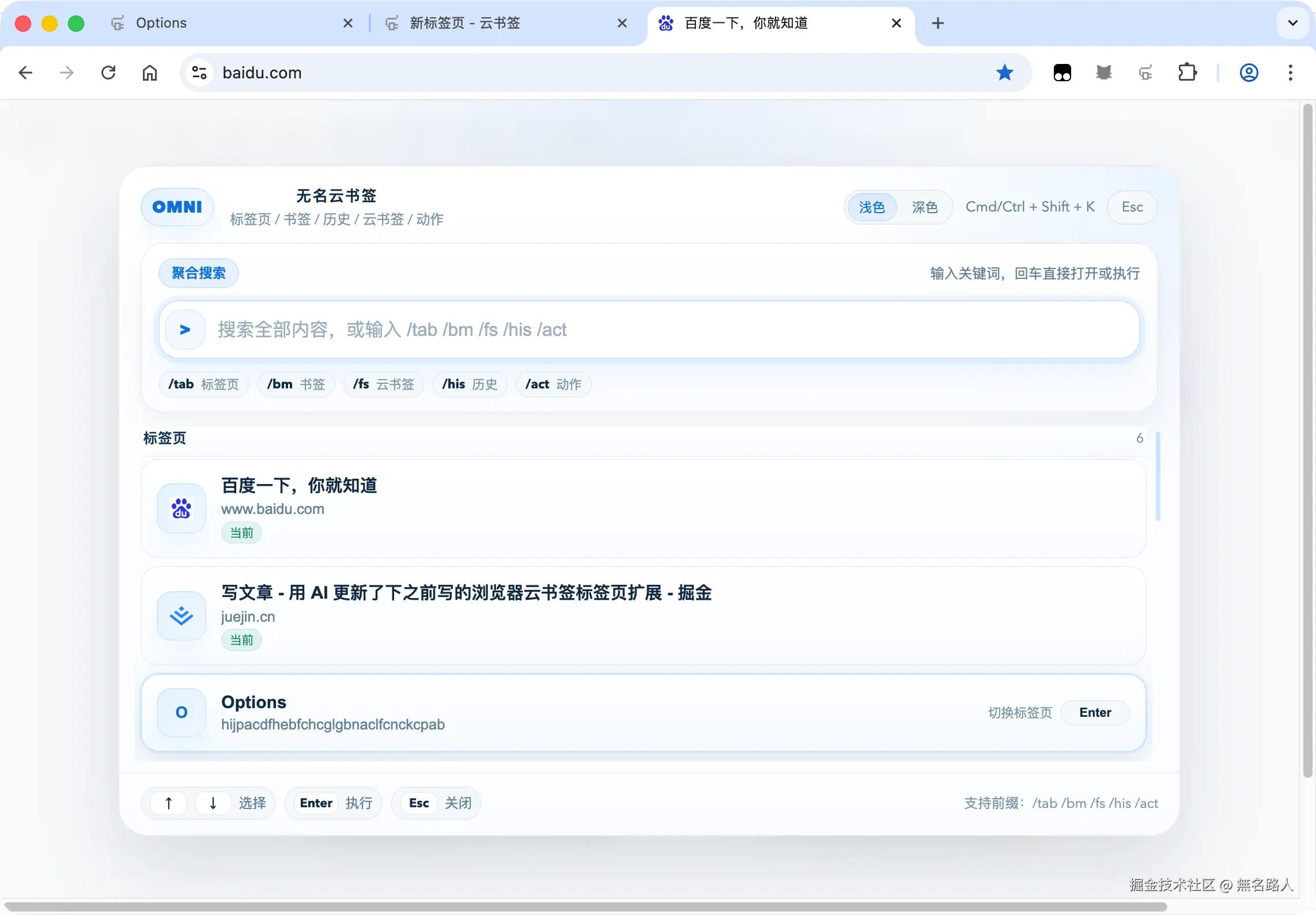 如果说新标签页解决的是"打开浏览器之后"的体验,那 Omni 命令面板解决的,就是"在任何页面里,怎么更快完成操作"。