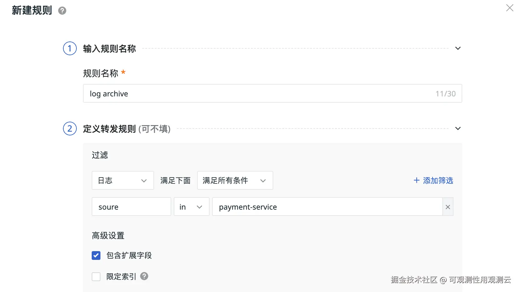 2、精准过滤配置:在"过滤条件"模块,可通过数据所带的标签,例如日志 source、host、service 等标签筛选,仅转发有用数据,从而避免无效的数据增加转发流量和存储成本。