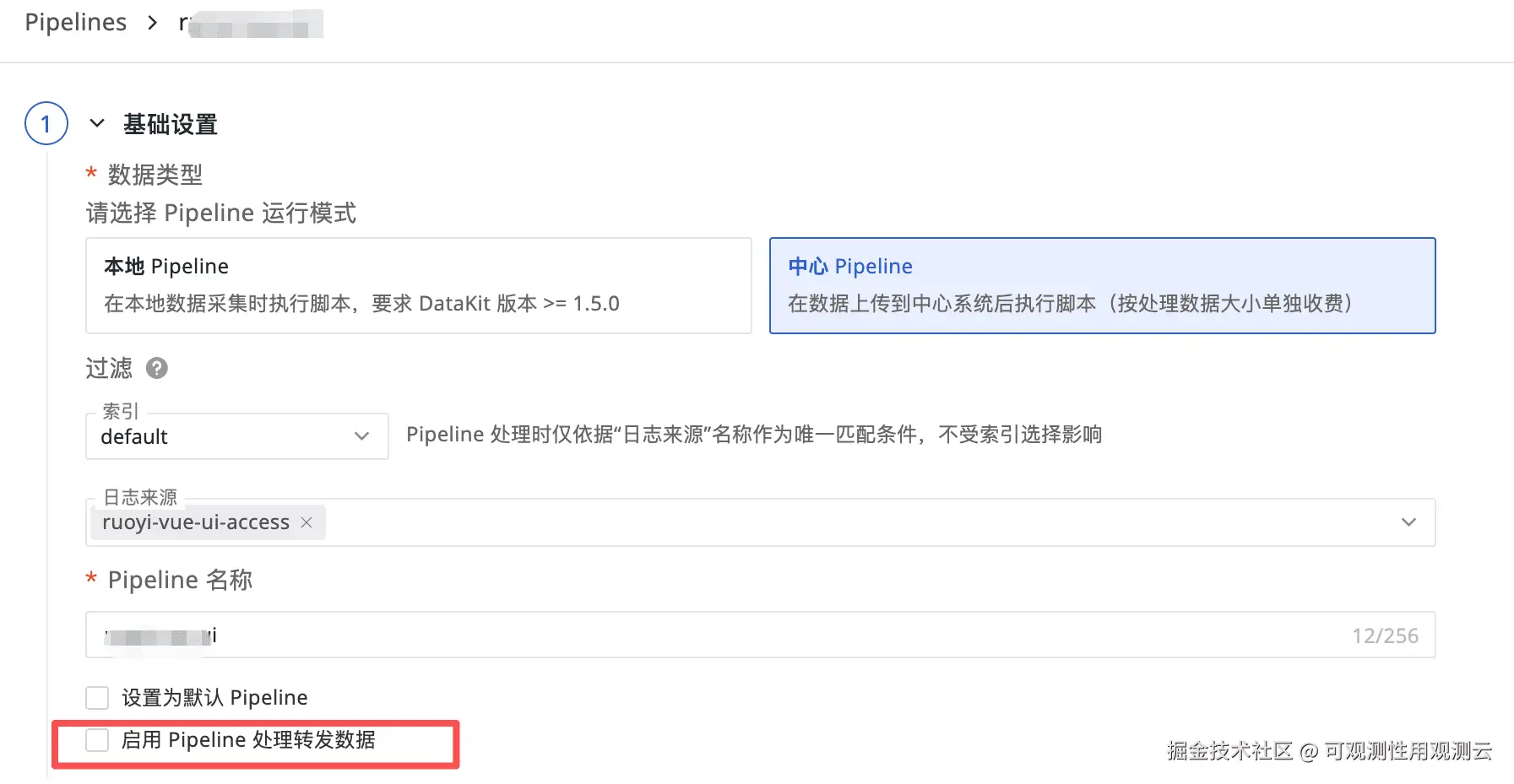 3、需要注意的是,如果需要使用观测云的 Pipeline 解析数据,同时将解析后的字段进行转发,可以使用观测云的中心 Pipeline 脚本:在创建 Pipeline 脚本时,可勾选"启用 Pipeline 处理转发数据":勾选后,数据先经脚本处理再过滤转存;不勾选则直接转发原始数据。