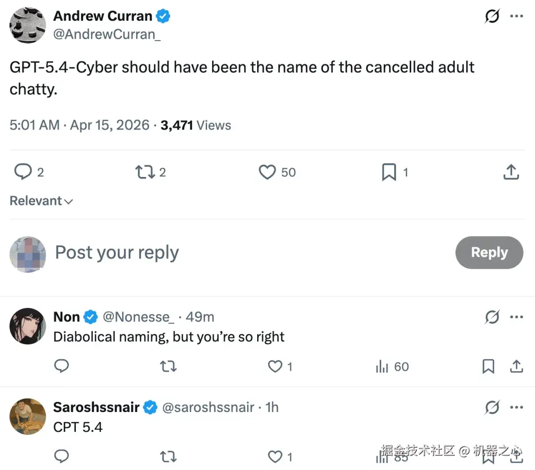 不过呢,这个模型的命名遭到了不少人的吐槽,「GPT-5.4-Cyber 这个名字听起来更像是一个被砍掉的成人聊天产品的名字。」