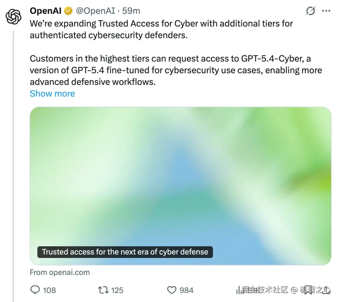 没放出大家伙心心念念的 GPT-5.5 或 GPT-6,OpenAI 刚刚发布了全新的、强调网络安全版本的「GPT-5.4-Cyber」。