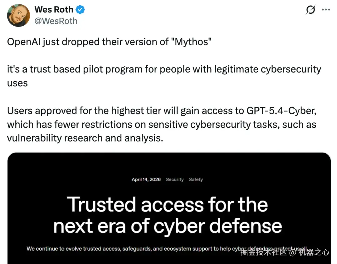 对此,OpenAI 表示,「我们正在扩展网络安全受信访问体系,为经认证的安全防御人员提供更多分级权限。最高级别的客户可以申请使用 GPT-5.4-Cyber,一个针对网络安全场景专门微调的 GPT-5.4 版本,支持更高级的防御工作流程。」