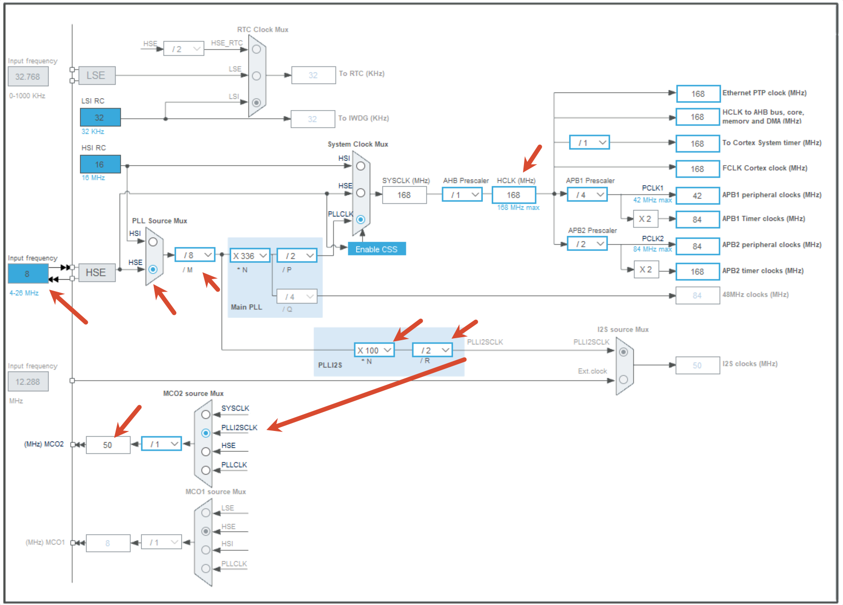 立创天空星的板子上贴的是 8M 晶振, 实际使用的时钟树可参考下图: