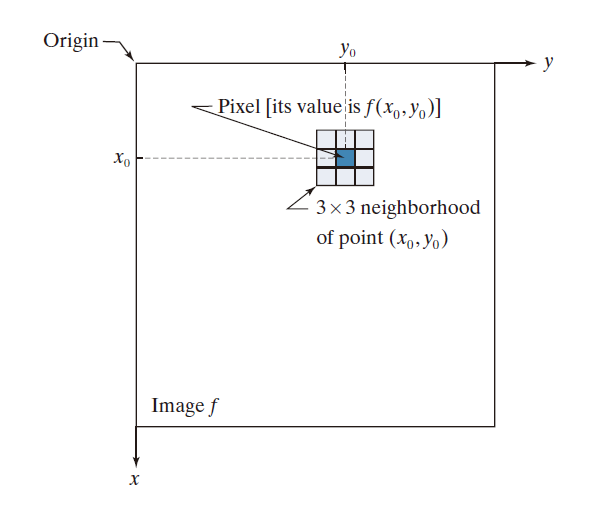 -------------------------------图 3.1 :图像中关于点 的 3 × 3 邻域。邻域在图像中从一个像素移动到另一个像素,以生成输出图像。回想一下第 2 章,位置