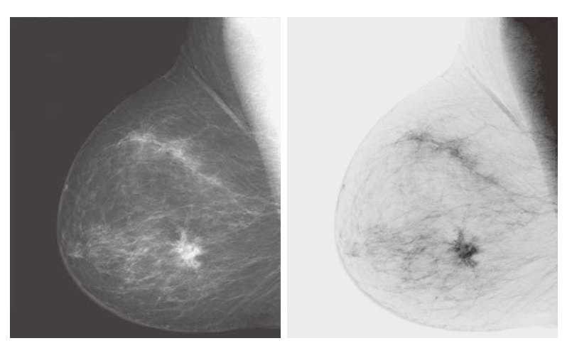 以这种方式反转数字图像的强度级别会产生与照片底片 (photographic negative)相同的效果。**例如,这种处理可用于增强嵌入在图像暗区中的白色或灰色细节,尤其是当黑色区域占主导地位时。**图 3.4 显示了一个例子。原始图像是显示小病变的数字乳房 X 光检查。尽管两幅图像中的视觉内容相同,但一些观众发现使用底片更容易分析乳房组织的精细细节。
