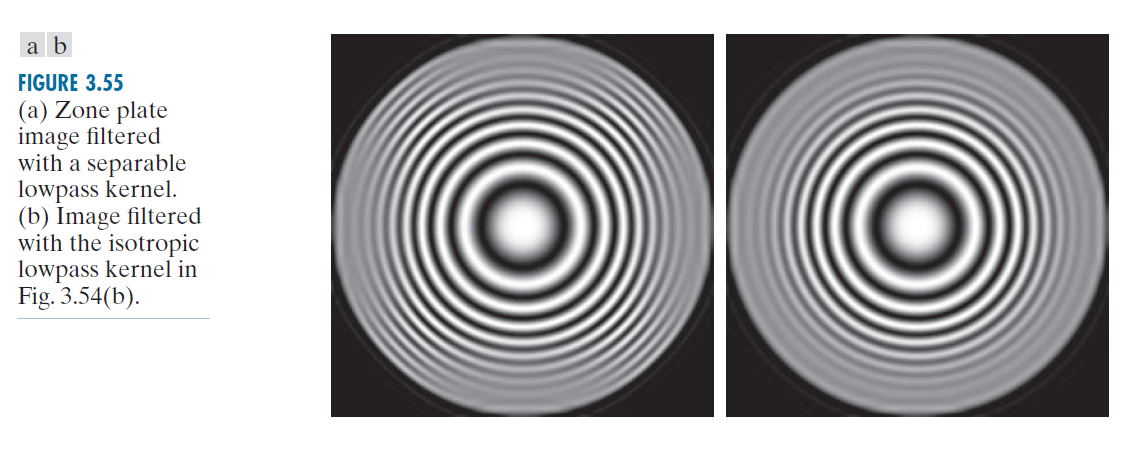 图 3.54(a) 展示了一个使用 MATLAB 设计的一维、128 元素空间低通滤波器函数(与图 3.32(b) 比较)。如前所述,我们可以使用此一维函数基于公式 (3-42) 构建一个二维可分离低通滤波器核,或者可以将其绕中心旋转以生成一个二维各向同性核。图 3.54(b) 中的核是使用后一种方法获得的。图 3.55(a) 和 (b) 分别是使用可分离核和各向同性核对图 3.53 中的图像进行滤波的结果。这两个滤波器都允许区域板的低频通过,同时显著衰减高频。然而,可以观察到,可分离滤波器核在通过的频率上产生了"近似方形"(非径向对称)的结果。这是使用非各向同性的可分离核对图像进行垂直方向滤波的结果。使用各向同性的核会产生在所有径向方向上均匀的结果。这符合预期,因为滤波器和图像都是各向同性的。