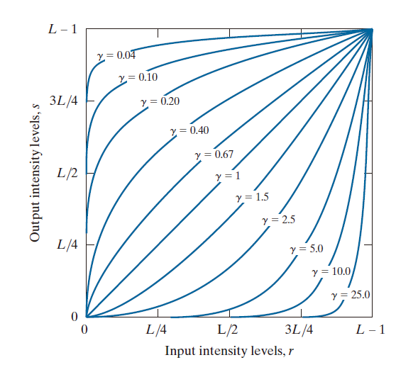 其中 c 和 γ 是正常量。有时候,公式(3-5)记为 以便于解释偏移 (offset)(即,当输入是0时的一个可测输出)。但是,偏移通常是显示校准的问题,因此在公式 (3-5) 中通常会忽略它们。图 3.6 显示了 s 作为 r 的函数对于各种γ 取值的图像片段。与对数变换一样,具有 γ 分数值的幂律曲线将较窄范围的暗输入值映射到较宽范围的输出值中,而对于较高的输入电平值则相反。另请注意,在图 3.6 中,只需通过改变γ 即可获得一系列变换。使用γ > 1 的值生成的曲线与使用γ < 1 的值生成的曲线具有完全相反的效果。当 c = γ= 1 时,公式 (3-5) 简化为恒等变换。