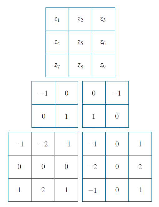 其中,x 和 y 按照前面描述的方式在图像维度上变化。公式 (3-60) 中所需的差分项可以用图 3.50(b) 和 (c) 中的两个核来实现。这些核被称为 Roberts 交叉梯度算子(Roberts cross-gradient operators)。