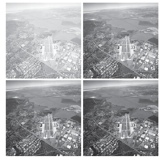 图 3.9(a) 显示了与图 3.8(a) 相反的问题。待处理的图像现在呈现出褪色的效果,表明需要对灰度等级进行压缩。这可以通过公式 (3-5) 使用大于 1 的 γ 值来实现。图 3.9(b) 至 (d) 分别显示了 γ = 3.0,4.0 和 5.0 时处理图 3.9(a) 的结果。使用 3.0 和 4.0 的 γ 值获得了合适的结果。后者的结果由于对比度更高而更具吸引力。使用 γ = 5.0 时获得的结果也是如此。例如,图 3.9(d) 中靠近图像中间的机场跑道比其他三幅图像中的任何一幅都更清晰。