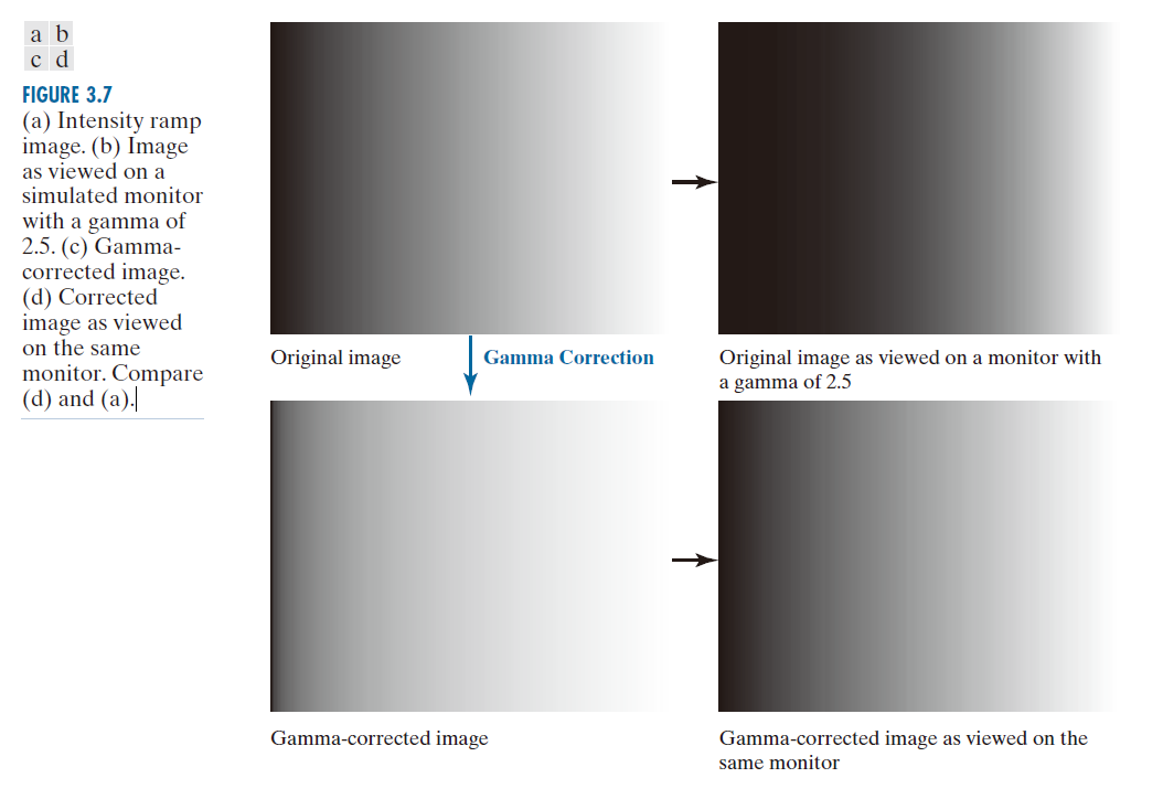 在这种情况下,γ 校正通过利用变换 以在将图像输入显示器之前对其进行预处理来实现。图 3.7(c) 是结果。当输入到同一台显示器时,经过γ 校正的图像产生的输出在外观上与原始图像接近,如图 3.7(d) 所示。类似的分析也适用于其他成像设备,例如扫描仪和打印机,区别在于γ值与设备相关 (Poynton [1996])。