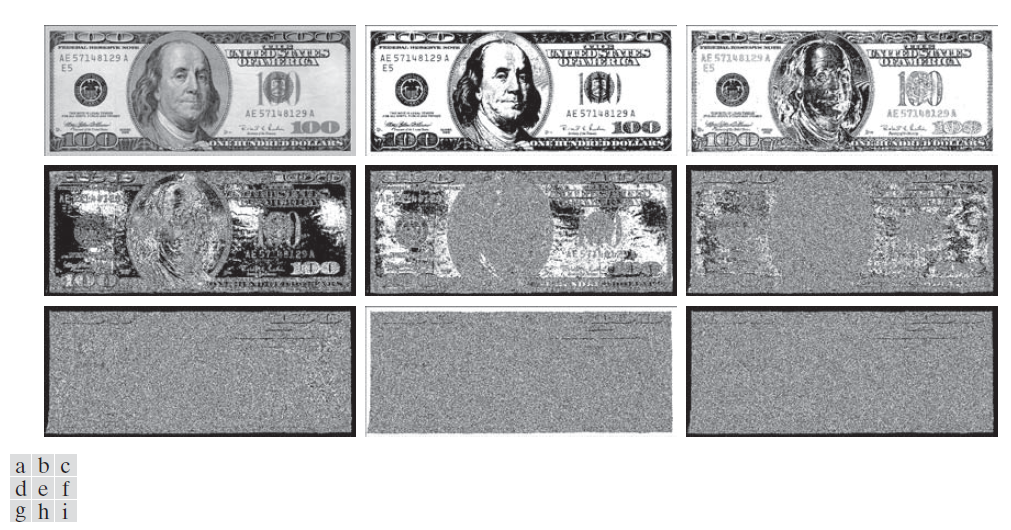 图 3.49(e) 显示了使用公式 (3-56) 并取 k = 4.5 的结果。这个值几乎是我们可以使用的极限值,而不会在图像中引入一些严重的伪影。伪影是字符边框周围出现暗淡的、几乎是黑色的光晕。这是由于图 3.48(d) 中下方的"光晕"变为负值造成的,正如我们之前解释的那样。当缩放图像使其仅显示正值时,负值要么被截断为 0,要么被缩放以使最负的值变为 0,具体取决于所使用的缩放方法。无论哪种情况,光晕都将是图像中最暗的值。