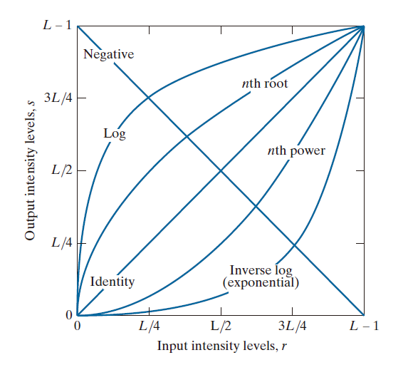 ---------------------------------图3.3:一些基本的强度变换函数。每条曲线都经过了独立缩放,因此所有曲线都适合同一张图。我们的兴趣在于曲线的形状,而不是它们的相对值。----------------------------------------------------------------------
