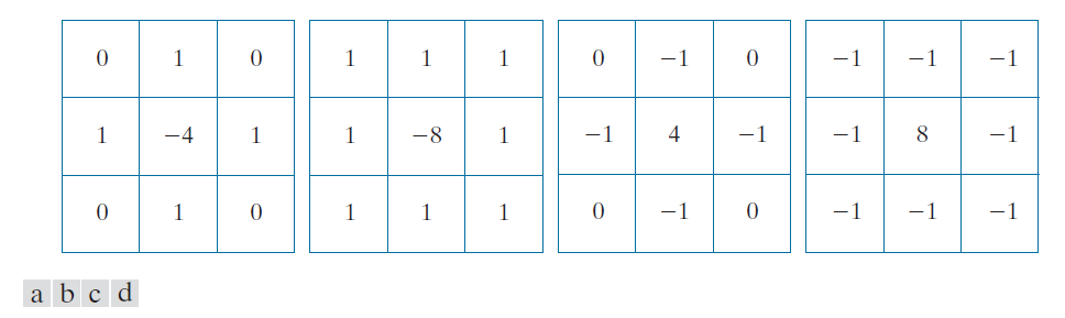--------------------------图 3.45:(a) 用于实现公式 (3-53) 的 Laplace 核。(b)用于实现包含对角线项的该公式扩展的核。(c)和(d)另外两个拉普拉斯核。---------------